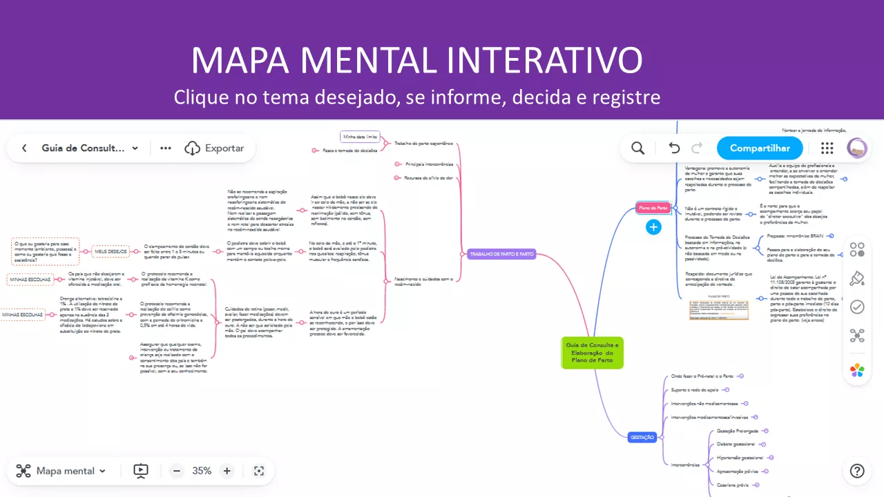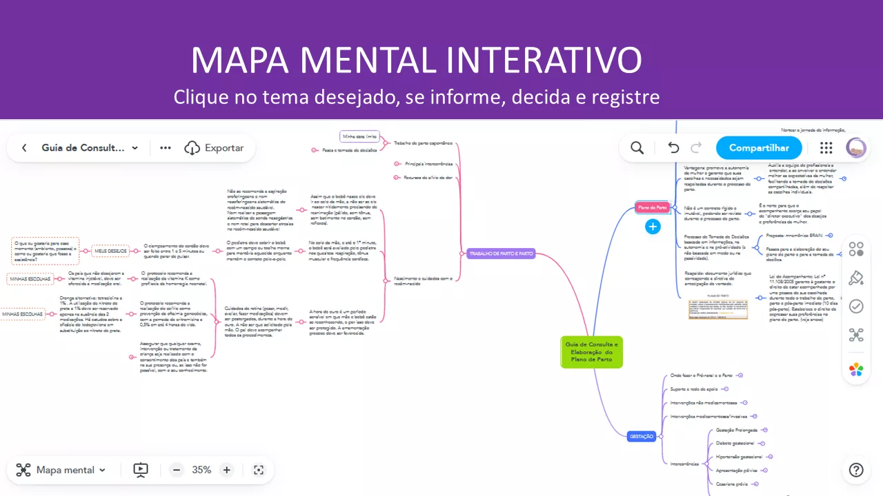 - Principais condutas e intervenções médicas na gestação, no parto e pós-parto: indicações, riscos, benefícios e alternativas para você tomar decisões com mais clareza e segurança, como por exemplo, indução de parto, analgesia, parto instrumental, cesariana, reanimação neonatal, etc.